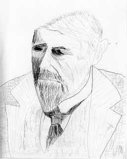 I drew this sketch of Joseph Conrad, apparently on August 3, 1997, when I was 31. I guess it would look okay, except carelessly I chopped off the top of his head like I was the Queen of Hearts but couldn't aim right. It was taken from this photo, which was on the cover of one his books that I had.